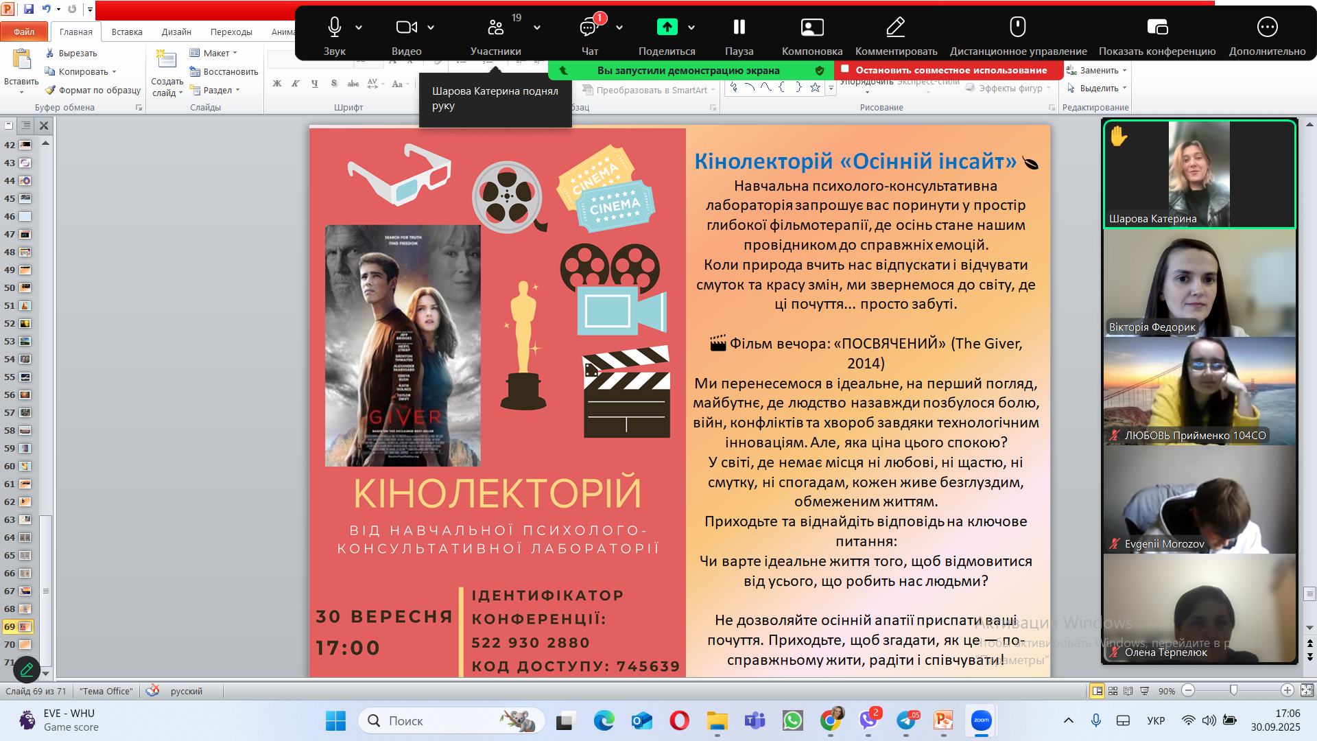Наприкінці вересня навчальна психолого-консультативна лабораторія провела перший у 2025-2026 навчальному році кінолекторій «Осінній інсайт», який став простором для глибокої фільмотерапії, де образ осені виступив символічною метафорою краси змін і смутку.