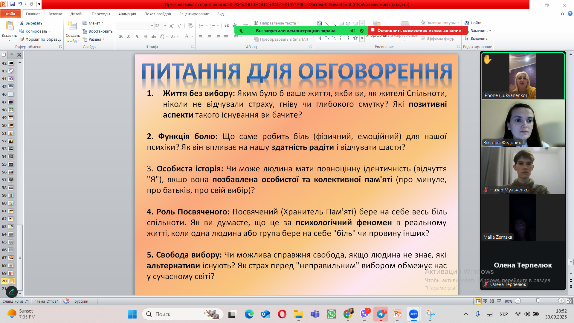 Обговорення зосередилося навколо ключового психологічного та філософського питання: «Чи варте ідеальне життя відмови від усього, що робить нас людьми?». Саме це питання спонукало до важливих усвідомлень та інсайтів щодо природи людських емоцій, вибору та ціни комфорту.