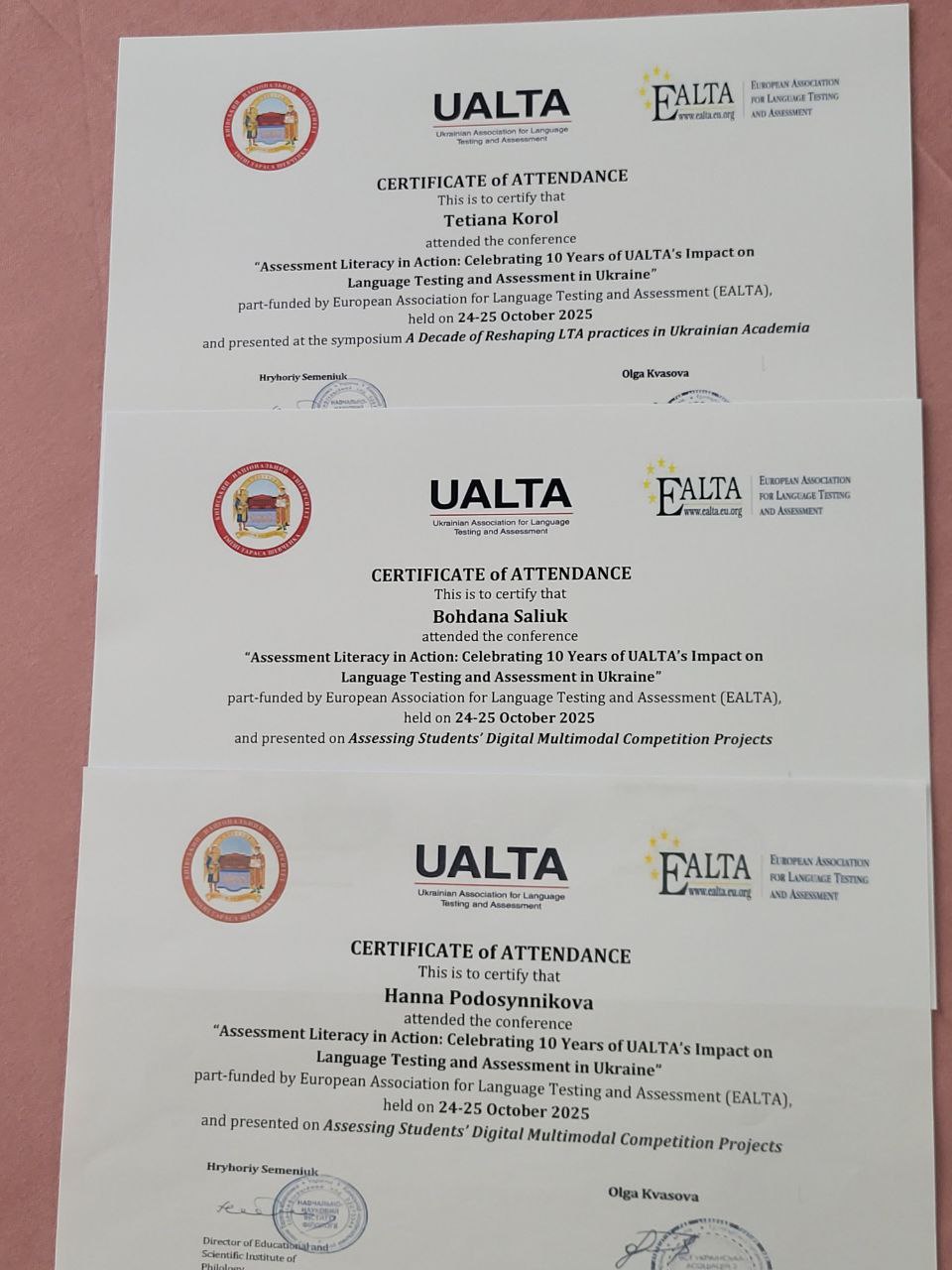 24-25 жовтня 2025 року відбулася науково-практична конференція “Assessment Literacy in Action: Celebrating 10 Years of UALTA’s Impact on Language Testing and Assessment in Ukraine”, присвячена десятиріччю діяльності Всеукраїнської асоціації з мовного тестування та оцінювання (UALTA).