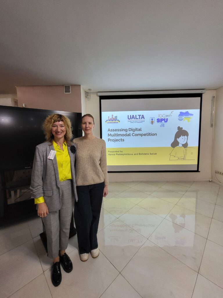 У секційній частині конференції Ганна Подосиннікова, кандидатка педагогічних наук, завідувачка кафедри англійської філології та лінгводидактики СумДПУ імені А.С.Макаренка, та Богдана Салюк, кандидатка філологічних наук, доцентка кафедри іноземних мов і методики викладання Бердянського державного педагогічного університету, представили спільну доповідь “Assessing Students’ Digital Multimodal Competition Projects”.