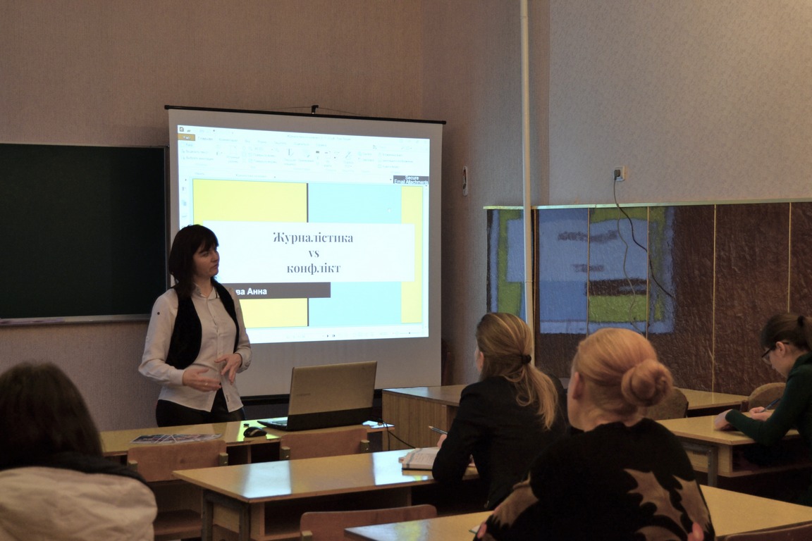 В останній березневий день о 10.00 на базі кафедри соціальних комунікацій БДПУ паралельно почалося 2 семінари для студентів-журналістів з теми «Конфліктологія для журналістів». Одноденний тренінг проводить Школа журналістики Українського католицького університету (м. Львів) при фінансовій підтримці Посольства Великої Британії в Україні, у співпраці з Центром інтеграції та розвитку, Одеською обласною Групою медіації. Тренери: Інна Терещенко, голова Ради Одеської обласної Групи медіації, кандидат філософських наук, доцент кафедри політології Інституту соціальних наук ОНУ ім. Мечникова, професійний посередник в переговорах, тренер; Анна Прокаєва, журналіст, медіаексперт і медіатренер, представник Інституту масової інформації у Харкові, Член Національної спілки журналістів України, учасниця Української миротворчої школи.