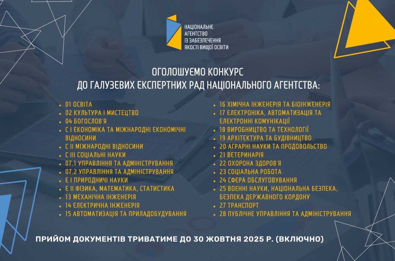 З 17 жовтня 2025 р. оголошується конкурс до галузевих експертних рад Національного агентства: