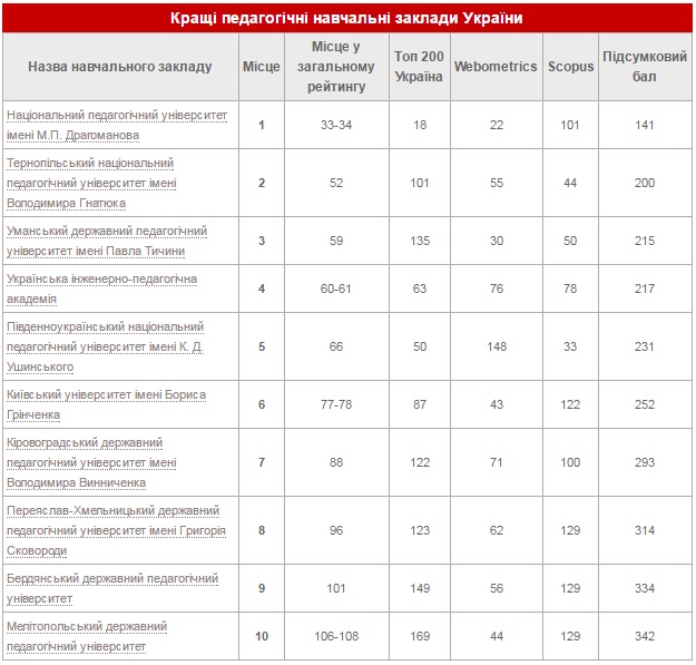Інформаційний ресурс "Освіта.ua" представляє педагогічні вузи, що посіли найвищі місця в консолідованому рейтингу вищих навчальних закладів України 2016 року.