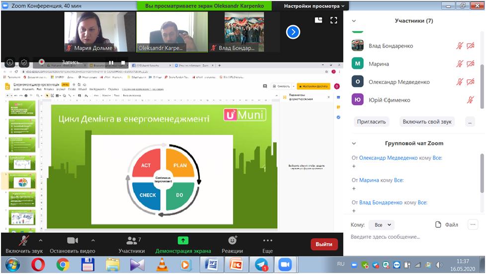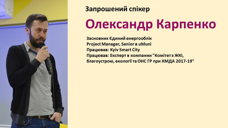О. Карпенко є керівником проєкту «uMuni» – найбільшого в Україні сервісу енергомоніторингу в бюджетній галузі, головою комітету екологічного моніторингу Професійної асоціації екологів України; ініціював проведення першого в Україні дослідження впливу світлового забруднення на довкілля країни спільно з Інститутом космічних досліджень НАН України та Асоціацією «Енергоефективні міста України», зараз входить у експертну робочу групу громадського проєкту EcoCity з впровадження національної громадської системи оповіщення ALARM, займався у 2018–2019 роках координацією екологічних проєктів у Kyiv Smart City. Запрошений спікер О. Карпенко розкрив тему енергоменеджменту, системності як основи щоденної роботи енергоменеджерів, нагадав усім про важливість не забувати Цикл Демінга та прагнути до ISO 50001.