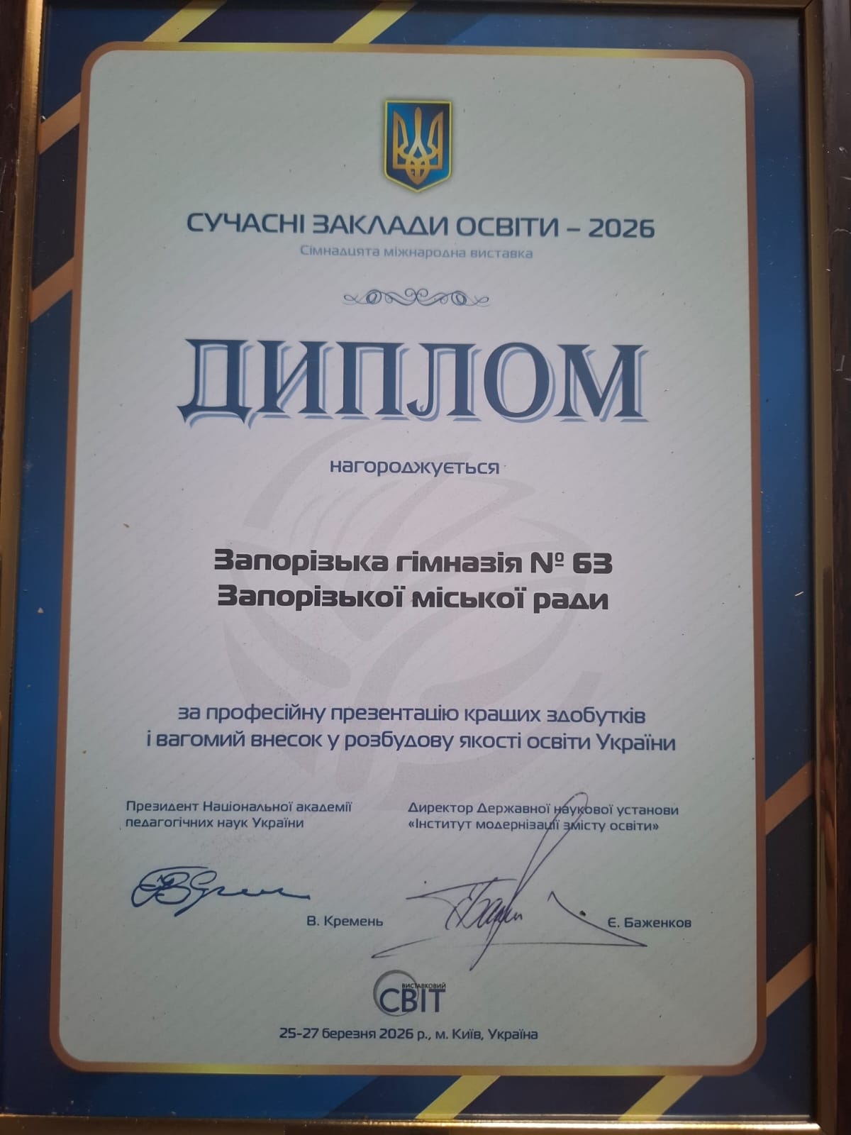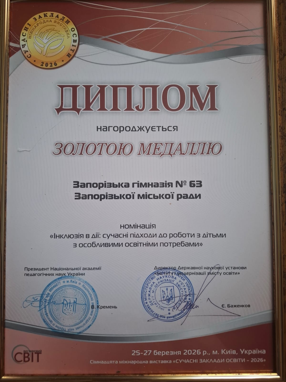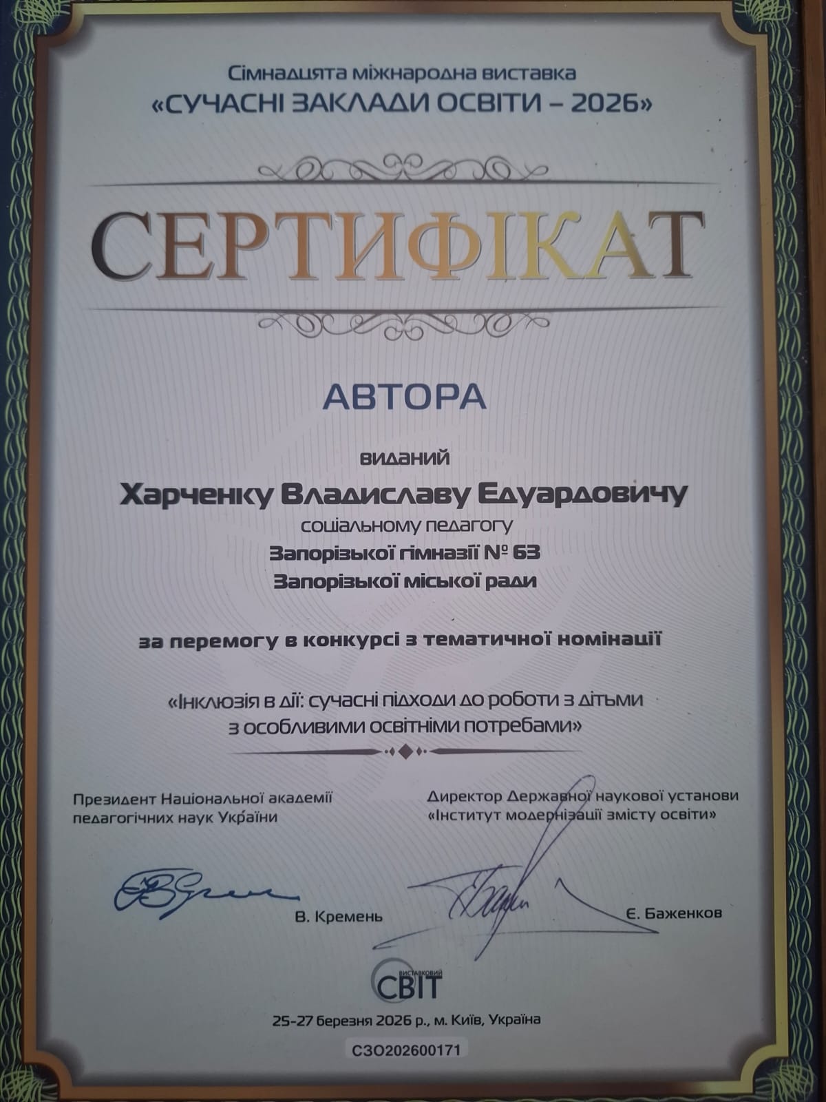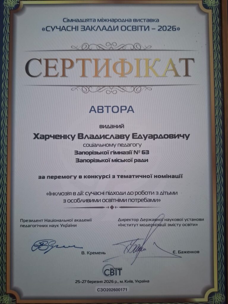 У межах Міжнародної виставки «Сучасні заклади освіти – 2026» він отримав золоту медаль для Запорізької гімназії №63 Запорізької міської ради, де працює практичним психологом та соціальним педагогом. Відзнаку присуджено у номінації «Інклюзія в дії: сучасні підходи до роботи з дітьми з особливими освітніми потребами».