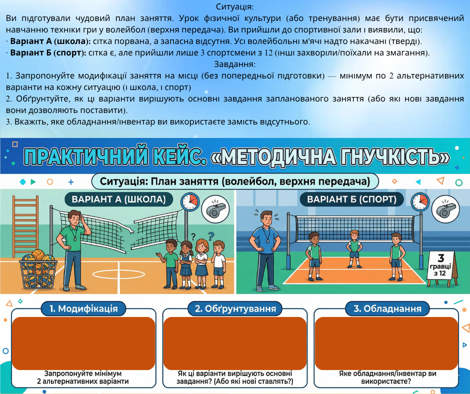 Олімпіада стала не лише перевіркою знань, а й справжнім іспитом на професійну зрілість та здатність діяти в нестандартних ситуаціях. Програма змагань складалася з двох змістовних блоків. Перший — теоретичний, де учасники демонстрували фундаментальні знання з методики викладання. Проте справжні пристрасті розгорілися під час розв’язання практичного кейса «Методична гнучкість». Учасникам запропонували ситуацію, з якою може зіткнутися сучасний вчитель чи тренер. Здобувачі мали за лічені хвилини модифікувати заняття, обґрунтувати нові завдання та підібрати альтернативний інвентар у форс-мажорних обставинах.