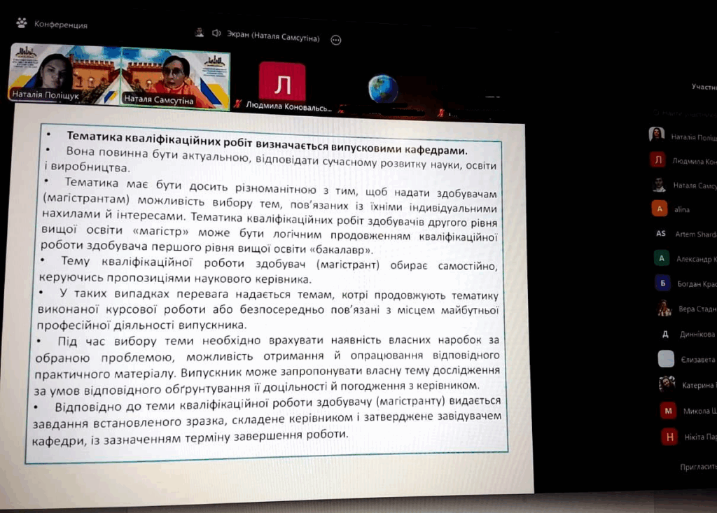 Окремо було розглянуто етапи підготовки магістерської роботи – від вибору актуальної теми до захисту. Студентів ознайомили з вимогами до структури роботи, особливостями формулювання мети, завдань, об’єкта й предмета дослідження, а також з критеріями оцінювання оригінальності текстів.