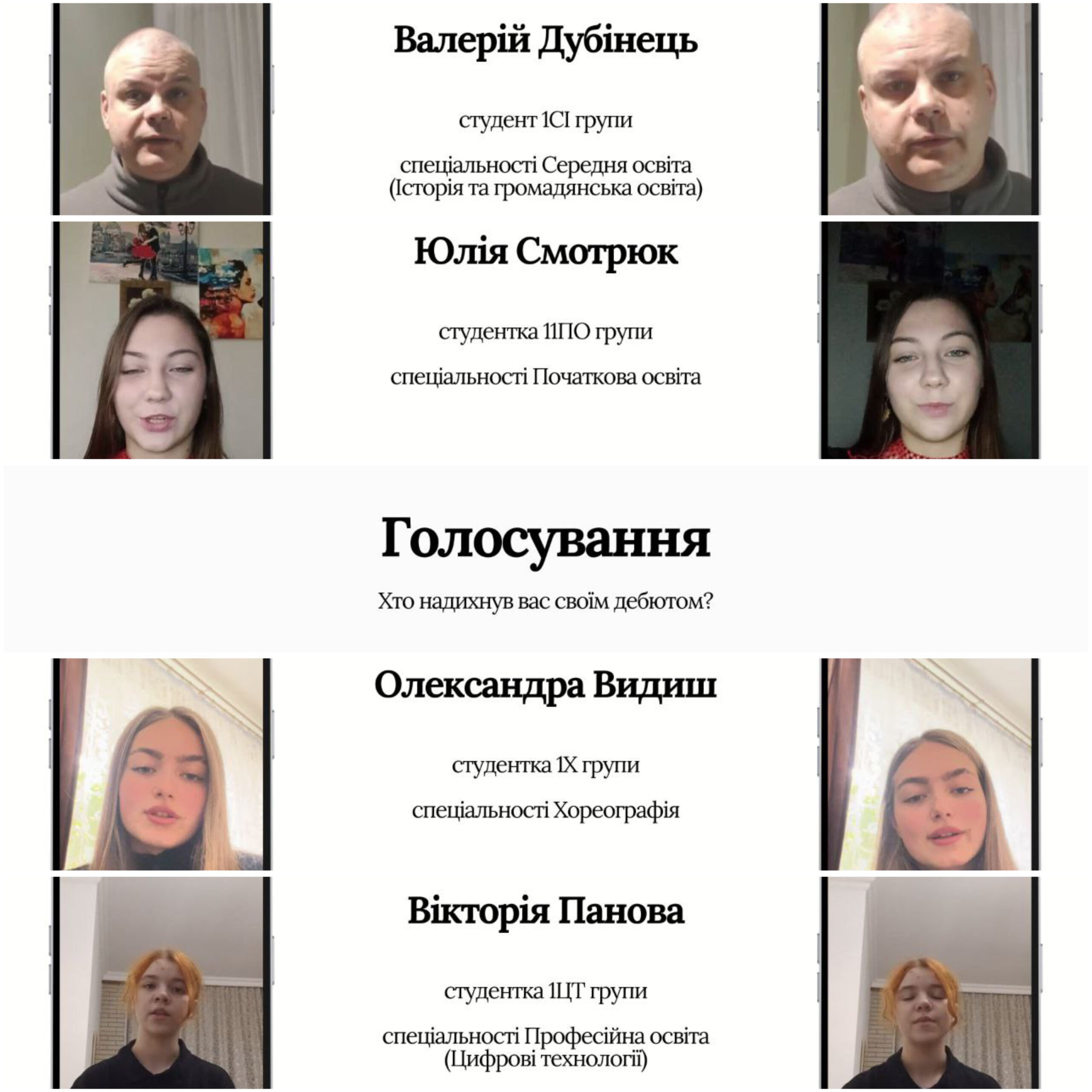 У конкурсі взяли участь студенти різних факультетів: Бабенко Марія, Бадюл Анна, Байрамова Лейла, Безь Кирило, Валєєв Микола, Видиш Олександра, Водяний Владислав, Демченко Кіра, Дубінець Валерій, Занін Давид, Кайдаш Віолетта, Меркулова Єлизавета, Мульченко Назар, Новоградська Альбіна, Панова Вікторія, Проценко Максим, Рибалкіна Катерина, Рудь Анна, Смотрюк Юлія, Терещенко Марія, Тимошенко Юлія, Труфанова Аріна, Хацько Анна.