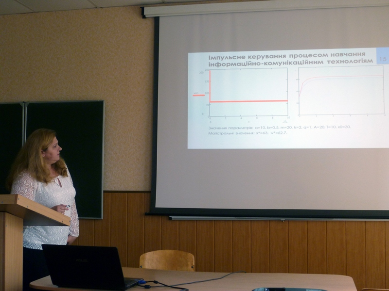 Доповідь доцента Наталі Кравченко на тему: «Оптимальне імпульсне керування навчанням інформаційно-комунікаційним технологіям» продемонструвала тонку грань між математикою та педагогікою. В роботі Наталі Володимирівни побудована математична модель навчання інформаційним технологіям, яка необхідна для аналізу ефективності процесу навчання в закладах освіти та на виробництві. Модель навчання інформаційним технологіям має вигляд нелінійного диференційного рівняння. Така модель припускає «агресивне» навчання, що приводить до стрибкоподібних змін у рівні оволодіння новою технологією. Формалізація такого навчання була здійснена за допомогою керувань імпульсного типу. Для того щоб візуалізувати результати математичного моделювання було використано систему комп'ютерної алгебри Mathcad.