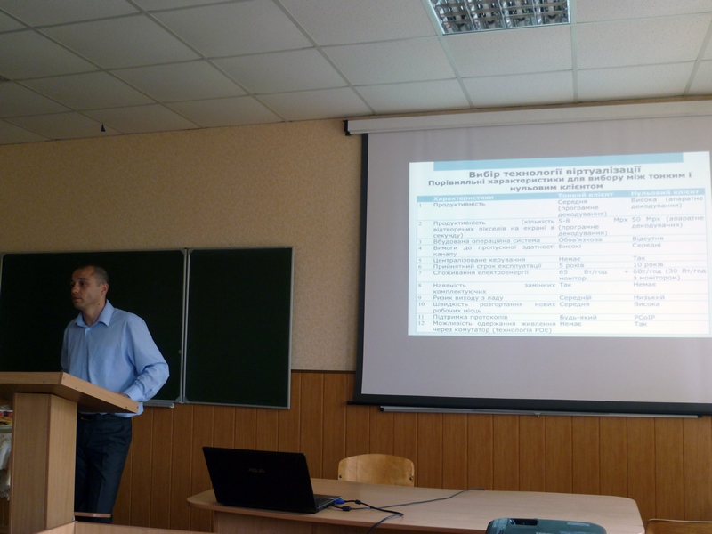 Доцент кафедри Максим Павленко презентував дослідження, присвячене проблемам модернізації навчальних комп’ютерних лабораторій у БДПУ. Він запропонував шляхи використання сучасних хмарних технологій для побудови освітнього середовища з використання комп’ютерних мереж та віртуальних робочих столів.