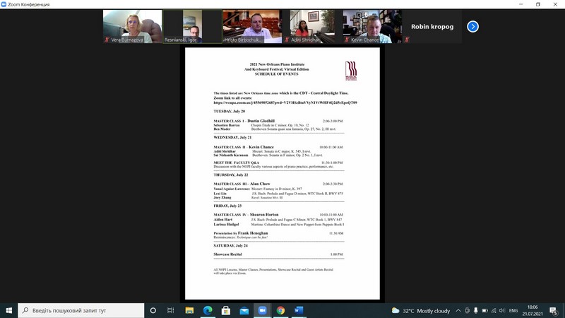 З метою розширення міжнародної співпраці, доцентка кафедри теорії і методики навчання мистецьких дисциплін Віра БУРНАЗОВА https://bdpu.org.ua/burnazova/ з 19 липня по 25 липня залучилась до, організованих у віртуальному форматі (ZOOM) Інститутом фортепіано в Новому Орлеані (New Orleans Piano Institute – NOPI), майстер-класів, лекцій, концерту за участі студентів Державного Університету Нового Орлеану (штат Луїзіана, США).