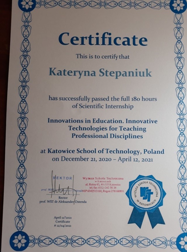 З грудня 2020 року по квітень 2021 року доцентка катедри початкової освіти Катерина Степанюк взяла участь у Міжнародному науково-педагогічному стажуванні «Innovations in education. Innovative technologies for teaching professional disciplines».