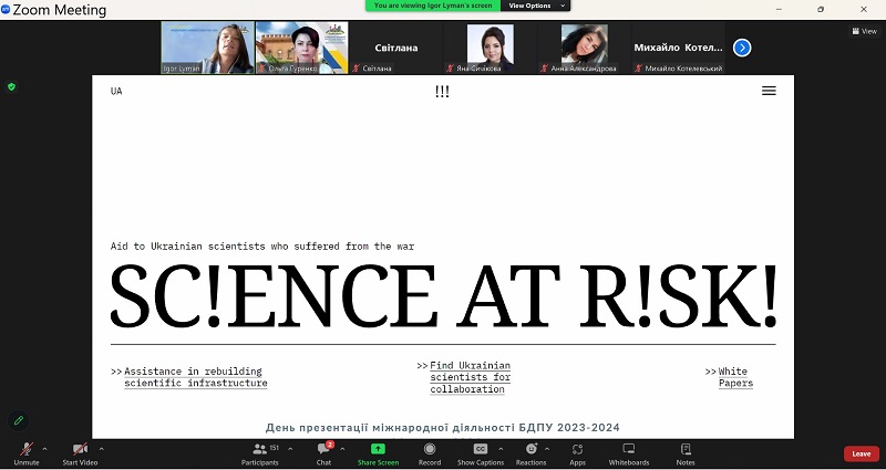 У рамках Днів науки в Бердянському державному педагогічному університеті пройшла презентація міжнародної діяльності за період травня 2023 року по травень 2024. Зустріч відбулася дистанційно о 14.00 16 травня 2024 року. Модерував захід координатор міжнародної діяльності БДПУ Ігор Лиман. Усіх присутніх привітала із міжнародним днем фестивалю та професійним святом проректорка Ольга Гуренко.