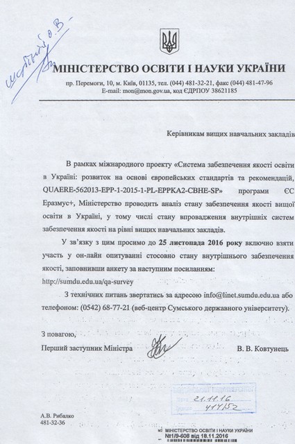 Днями Міністерство Освіти і Науки України розіслало керівникам вищих навчальних закладів лист, яким повідомило, що в рамках проекту QUAERE воно проводить аналіз стану забезпечення якості вищої освіти в Україні, у тому числі стану впровадження внутрішніх систем забезпечення якості на рівні вищих навчальних закладів. Тож МОН звернулось до вітчизняних ВНЗ з проханням взяти участь в опитуванні стосовно стану внутрішнього забезпечення якості, заповнивши online анкету, розроблену консорціумом проекту QUAERE.