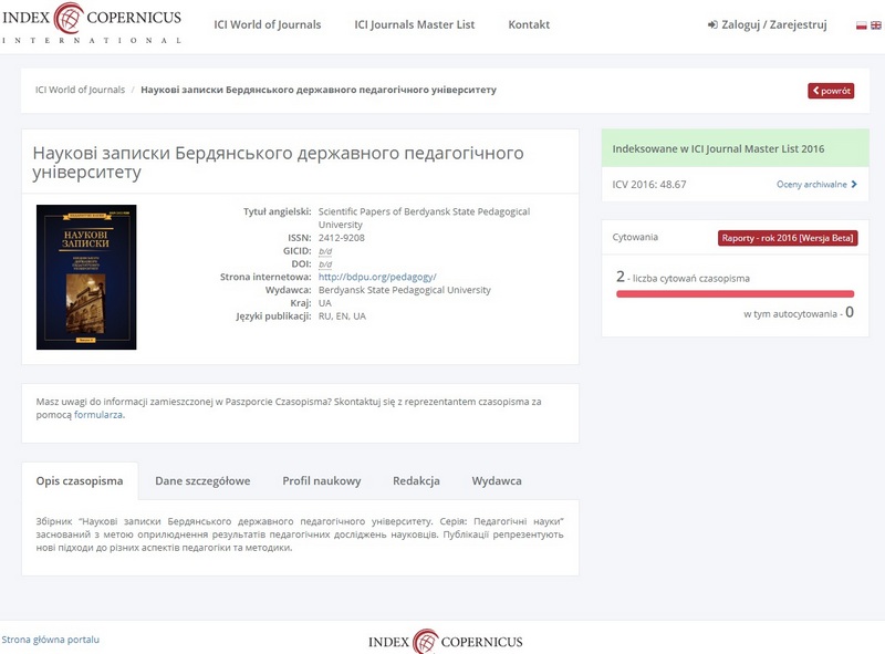 Бердянський державний педагогічний університет системно підходить до питання інтеграції до європейського і світового науково-освітянського простору, що підтверджується підвищенням публікаційної активності викладачів університету в престижних виданнях, що входять до авторитетних наукометричних баз, а також включенням фахових періодичних видань вишу до цих баз. Упродовж 2017 року фахові видання БДПУ “Наукові записки Бердянського державного педагогічного університету. Серії: Філологічні науки, Педагогічні науки” проходили реферування в міжнародній наукометричній базі даних Index Copernicus (Польща), яка включає індексування, ранжування та реферування журналів, а також є платформою для наукової співпраці та виконання спільних наукових проектів, і отримали схвальні рішення (Філологічні науки: https://journals.indexcopernicus.com/search/details?id=46571&lang=pl; Педагогічні науки: https://journals.indexcopernicus.com/search/details?id=46554&lang=pl ).
