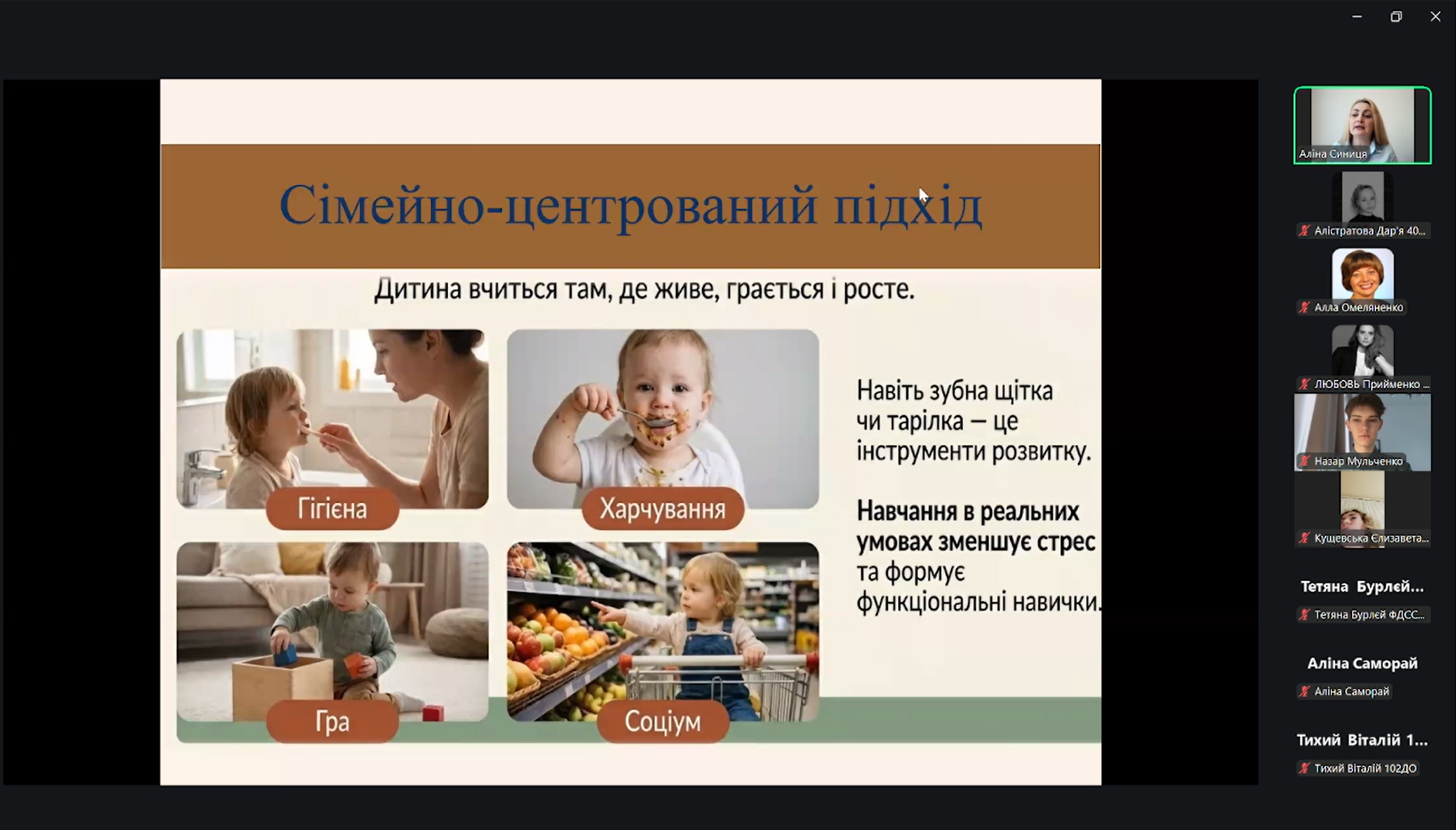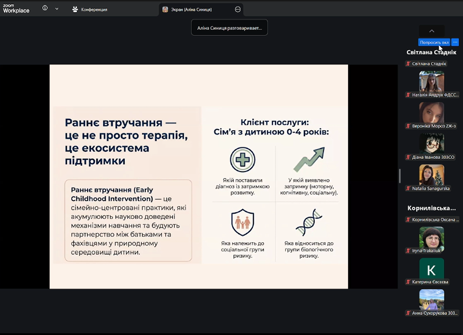 Під час лекції було акцентовано увагу на важливості розвитку послуги раннього втручання в умовах сучасних демографічних викликів та необхідності своєчасного виявлення порушень розвитку у дітей раннього віку. Наголошувалося, що період від народження до чотирьох років є критичним для формування інтелекту, психіки та особистості дитини, тому рання підтримка сімей має надзвичайно важливе значення. Послуга раннього втручання спрямована на комплексну підтримку сімей із дітьми, які мають порушення розвитку або ризик їх виникнення, сприяє попередженню інвалідизації та інституалізації дітей, а також покращенню якості життя родин.