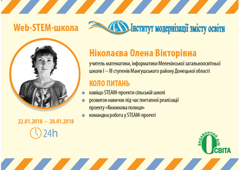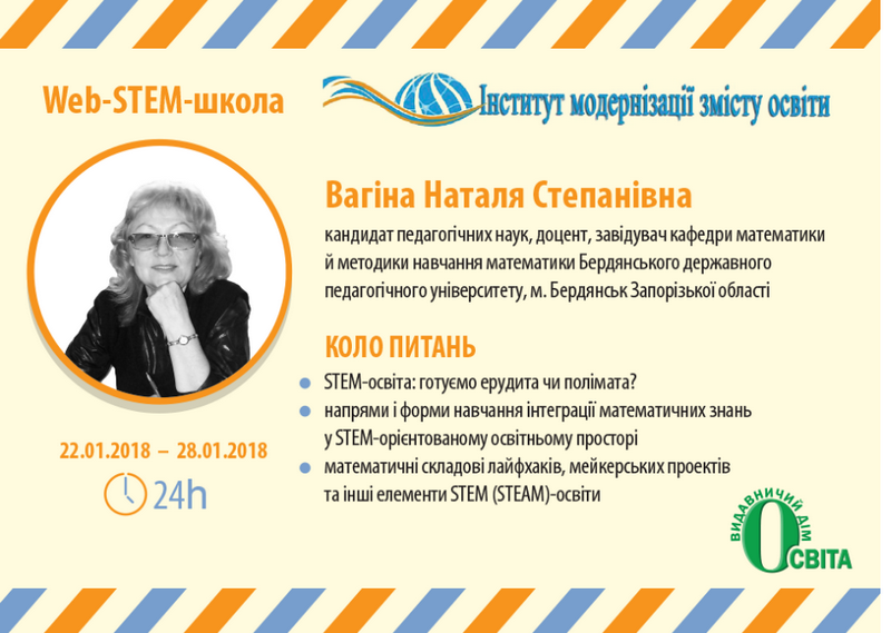 Web-STEM-школа – це масштабний проект Державної наукової установи «Інститут модернізації змісту освіти», університету менеджменту освіти НАПН України, що реалізується за підтримки багатьох партнерів і спрямований на просування перспективних освітніх технологій. Підготовку у Web-STEM-школі можуть пройти всі бажаючі, які пройшли реєстрацію та отримали безкоштовний дистанційний доступ до основних матеріалів і додатків. Сесійні заняття завершуються підсумковим тестуванням, за результатами якого учасники отримують сертифікати про навчання.