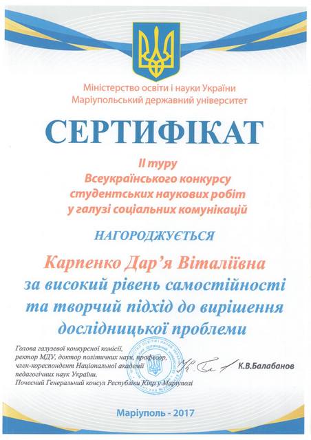 У Маріупольському державному університеті 10 березня 2017 р. проходив ІІ тур Всеукраїнського конкурсу студентських наукових робіт у галузі соціальних комунікацій, у якому взяла участь наша студентка 5 курсу факультету філології та соціальних комунікацій Дар’я Карпенко. Вітаємо Дар’ю із визнанням у царині науки і почесною нагородою!