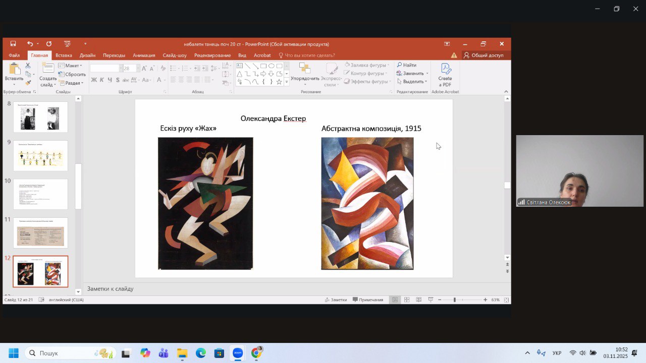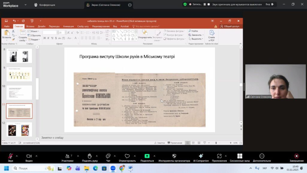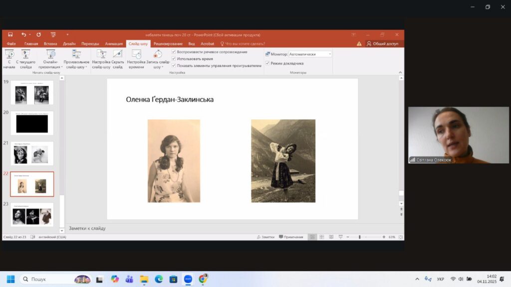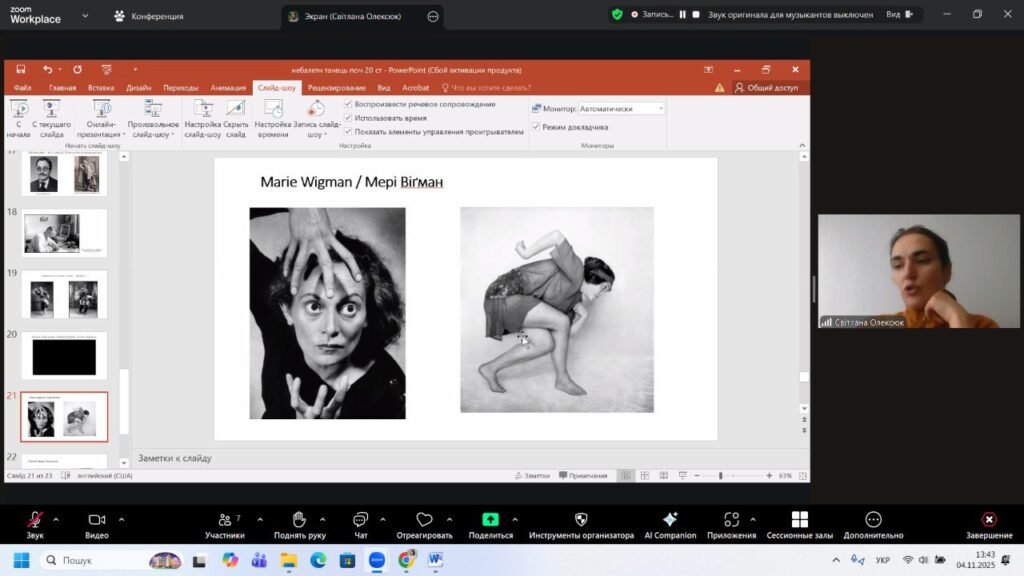 У рамках освітнього компоненту «Історія мистецтв» (викладач – доц. Юлія Тараненко) відбувся цикл гостьових лекцій від дослідниці танцю, хореографині, перформерки, старшої наукової співробітниці Музею української діаспори м. Києва Світлани Олексюк для здобувачів першого (бакалаврського) рівня вищої освіти І курсу спеціальності В.6. Перформативні мистецтва, спеціалізації В6.03. Хореографічне мистецтво.
