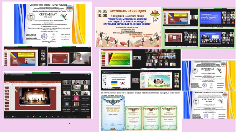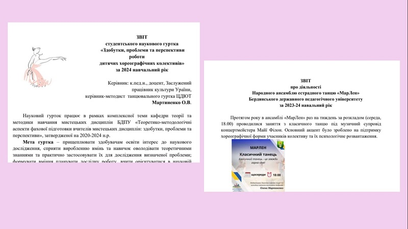 Основний акцент в роботі наукового гуртка «Здобутки, проблеми та перспективи роботи дитячих хореографічних колективів» було зроблено на вивчення досвіду роботи керівників хореографічних колективів в умовах воєнного стану в Україні, визначення та практичну апробацію форм та методів он-лайн хореографічного навчання, розповсюдження результативного досвіду через виступи на наукових конференціях та семінарах-практикумах, публікацію наукових статей та тез. Результатами стали публікації наукових тез в збірках Міжнародних наукових конференцій – 5, Всеукраїнських – 2, в збірнику тез наукових доповідей здобувачів вищої освіти Бердянського державного педагогічного університету на Днях науки 14 травня 2024 року – 5 та в матеріалах педагогів Центру дитячо-юнацької творчості ім. Є. Руднєвої по опрацюванню проблемної теми «Підвищення якості освітніх послуг в закладі позашкільної освіти» – 2. Члени гуртка проявили активність шляхом виступів на наукових конференціях (м. Київ, м. Полтава, м. Одеса, м. Умань, м. Херсон, м. Бердянськ), вкотре підкреслюючи імідж високого рівня професійної підготовки хореографів в Бердянському державному педагогічному університеті. Також дипломом за кращий науковий виступ на Днях науки на фестивалі науки БДПУ отримала студентка 3 курсу спеціальності 024 Хореографія Валерія Волкова.