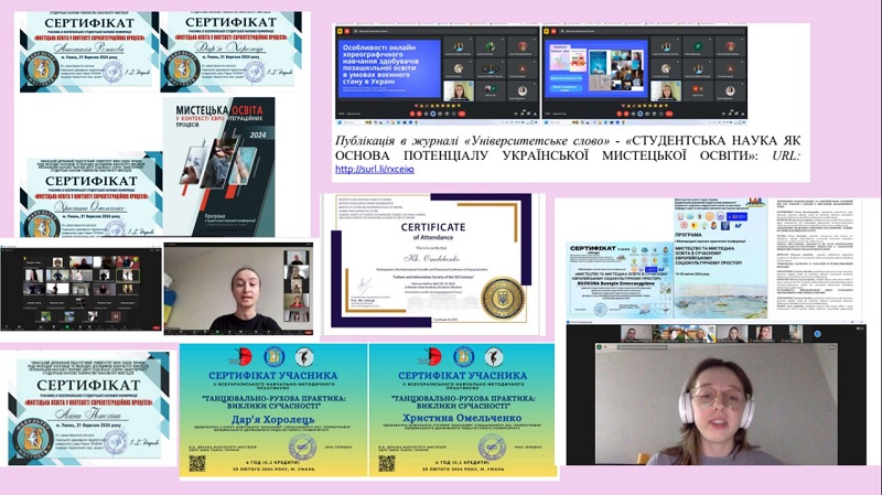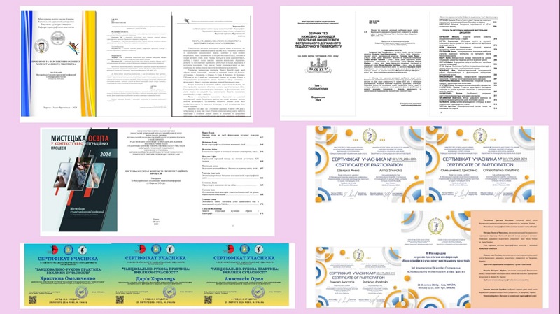 Крім того членами гуртка було отримано сертифікати щодо підвищення кваліфікації на ГО «Платформа освіти» з прослуховування тем щодо особливостей роботи керівника хореографічного колективу в умовах воєнного стану в Україні та сертифікати учасників ІІ-го Всеукраїнського навчально-практичного практикуму «Танцювально-рухова практика: виклики сучасності».