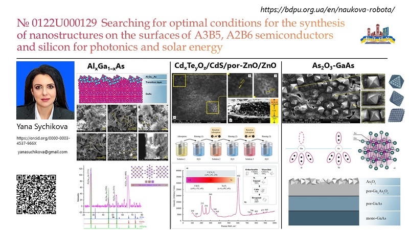 • Проєкт №0122U000129 «Пошук оптимальних умов синтезу наноструктур на поверхні напівпровідників А3В5, А2В6 і кремнію для фотоніки і сонячної енергетики» (керівник – Яна Сичікова) передбачає новаторські дослідження оптимальних умов для синтезу наноструктур на напівпровідниках для фотоніки та сонячної енергії. Напівпровідники групи А3В5, А2В6 та кремній є основними матеріалами сучасної електроніки, фотоніки тощо. Активно використовуються вони також у фотоелектричних перетворювачах енергії. Кремній є основним матеріалом для багатьох пристроїв через свою доступність та відносну дешевизну. Однак за багатьма характеристика він значно поступається напівпровідникам групи А3В5 (GaAs, GaP, InP тощо) та А2В6 (ZnTe, CdTe, CdS, CdSe, ZnS, ZnSe). Повсілякому використанню напівпровідників А2В6 і, тим більше, А3В5 першкоджають складності, що виникають при вирощувані високоякісних монокристалів, наявність великої кількості поверхневих і структурних дефектів, висока вартість таких напівпровідників і технологій їх вирощування. Наявні проблеми можна мінімізувати шляхом структуризації поверхні. При формуванні нанорел’єфу спостерігається збільшення ефективної площі у десятки та сотні разів, зменшується кількість структурних дефектів за рахунок виходу дислокацій, проявляються принципово нові властивості тощо. Проект присвячено вирішенню важливої науково-прикладної проблеми – розробці матеріалознавчих основ синтезу наноструктур на поверхні напівпровідників у дешевий та простий спосіб. Це дозволить значно покращити якісні показники матеріалів, знизити їх вартість по відношенню до користі та стане передумовою промислового виготовлення для подальшого використання їх як матеріалу фотоніки та сонячної енергетики. Це дослідження обіцяє просування екологічно чистих енергетичних рішень, які ідеально узгоджуються з глобальними зусиллями щодо кліматично нейтрального виробництва.