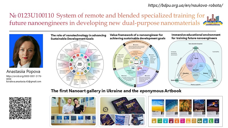 • Проект 0123U100110 спрямований на вирішення актуальної проблеми підготовки наноінженерів, здатних виготовляти матеріали подвійного та воєнного призначення, в умовах змішаного, дистанційного формату з використанням технологій синхронного та асинхронного навчання.  За результатами дослідження планується розробити методичну систему дистанційної профілізованої підготовки майбутніх фахівців у галузі наноматеріалознавства до розробки нових наноматеріалів подвійного призначення. В основу цієї системи  будуть покладені адаптовані до нових реалій механізми та технології профільної фундаментальної підготовки фахівців з урахуванням наявних ресурсів: в умовах обмеження доступу до інтернету, обладнання та світла – на основі застосування технологій синхронного та асинхронного навчання дистанційної освіти, а також використання нових підходів, що включатимуть роботу в центрах колективного користування обладнанням як офлайн так і при віддаленому доступі. Також будуть розроблені методики використання сучасних баз даних та програмних продуктів, що дозволяють оцінювати властивості наноструктур, моделювати склад нових наноматеріалів та прогнозувати їхнє використання у технологіях подвійного призначення.
