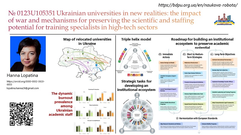 • Проєкт 0123U105351 «Українські університети у нових реаліях: вплив війни та механізми збереження науково-кадрового потенціалу для підготовки фахівців високотехнологічних галузей» (керівник – Ганна Лопатіна) спрямований на спрямований на вирішення актуальної проблеми збереження наукового та кадрового потенціалу підготовки фахівців високотехнологічних галузей.  За результатами дослідження планується розробити концепцію збереження наукового та кадрового потенціалу підготовки фахівців високотехнологічних галузей у нових реаліях через усвідомлення впливу війни на вищу освіту України та розробки дієвих механізмів подолання соціально-психологічних, економічних, викликів, з якими зіткнулися викладачі та студенти українських університетів. В основі проєкту лежить комплексний підхід “Наука – освіта – інноваційне підприємництво”, за якого через наукову діяльність викладача здобувачі отримують унікальні компетентності та навички дослідно-конструкторської діяльності, які задовольняють кон’юнктуру ринку праці та забезпечать розвиток високотехнологічних галузей виробництва для посилення безпекової спроможності України та служіння суспільству.