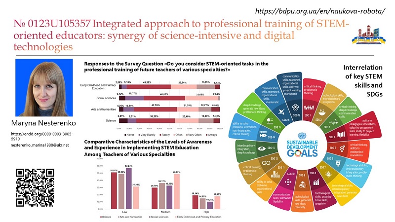 • Проект 0123U105357 «Інтегрований підхід до професійної підготовки STEM-орієнтованих педагогів: синергія наукоємних і цифрових технологій» (керівник – Марина Нестеренко), спрямовано на розв’язання актуальної проблеми професійної підготовки STEM-орієнтованих педагогів з фокусом на синергію наукоємних і цифрових технологій, що узгоджується з Концепцією розвитку природничо-математичної освіти (STEM-освіти) в Україні та Цілями сталого розвитку. Результатом дослідження буде робоча модель формування готовності майбутніх STEM-орієнтованих педагогів до професійної діяльності, яка стане основою для подальшого вдосконалення навчальних планів, освітньо-професійних програм і компонент у педагогічних закладах вищої освіти.  У проєкті буде запропоновано дієву стратегію інтеграції наукоємних і цифрових технологій у систему професійної підготовки майбутніх учителів різного профілю. Це забезпечить пролонгований прогресивний розвиток освітньої екосистеми з пріоритетом на STEM-підхід і, не лише підготує здобувачів вищої освіти до викликів ХХІ століття, а й навчить їх реалізовувати свої компетенції в практиці роботи з дітьми й молоддю нової генерації. Цей процес створить ланцюг інновацій і зростання, що гарантуватиме сталий розвиток нашої держави
