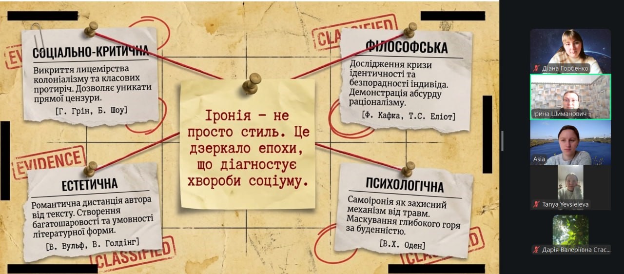 Переможна робота з філології була присвячена дослідженню особливостей використання іронії та сарказму в англомовній літературі ХХ століття на прикладі роману Джорджа Орвелла «Колгосп тварин». У дослідженні проаналізовано художні засоби створення сатиричного ефекту та їхню роль у розкритті соціально-політичної проблематики твору, що є  результатом ґрунтовного лінгвістичного аналізу і вміння інтерпретувати підтекстові смисли.