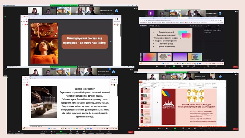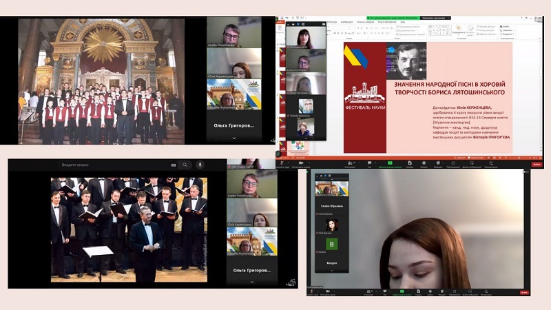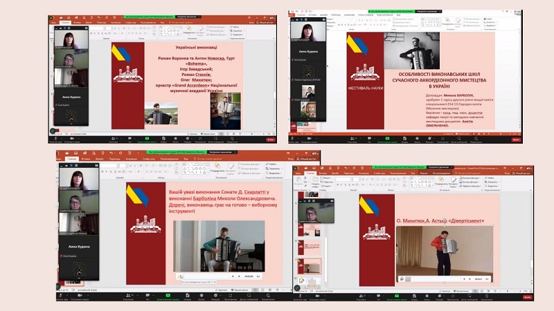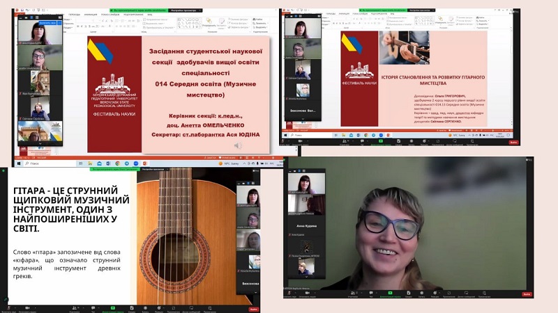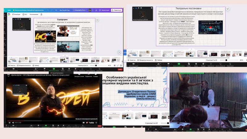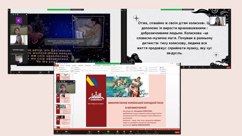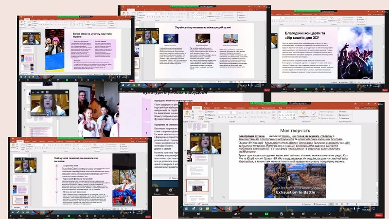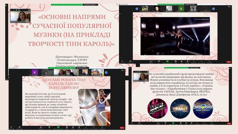 Кожен виступ продемонстрував здатність аналізувати, працювати з першоджерелами, робити висновки. Цікавими була тематика досліджень, де були теми, які пов’язані з виконавською діяльністю: «Особливості виконавських шкіл сучасного акордеонного мистецтва в Україні», доповідач Барболін Микола, здобувач 1 курсу друг-ого рівня вищої освіти, науковий керівник – канд. пед. наук, доцентка кафедри теорії та методики навчання мистецьких дисциплін Анетта Омельченко; «Історія становлення та розвитку гітарного мистецтва», доповідачка Ольга Григорович, доповідачка здобувачка 2 курсу першого рівня вищої освіти, науковий керівник – канд. пед. наук, доцентка кафедри теорії та методики навчання мистецьких дисциплін Світлана Сергієнко; розглядалася творчість українських діячів та їх здобутки: «Значення народної пісні в хоровій творчості Бориса Лятошинського», доповідачка Юлія Керженцева, здобувачка 4 курсу першого рівня вищої освіти, науковий керівник – канд. пед. наук, доцентка кафедри теорії та методики навчання мистецьких дисциплін Вікторія Григор’єва; «Значення творчості Василя Верховинця для розвитку української культури», доповідачка Анна Кудіна, здобувачка 2 курсу першого рівня вищої освіти, науковий керівник– канд. пед. наук, доцентка кафедри теорії та методики навчання мистецьких дисциплін Анетта Омельченко; «Інструментальна творчість Володимира Івасюка – музичний генофонд самоусвідомлення українців», доповідачка Ірина Глазунова, здобувачка 3 курсу першого рівня вищої освіти, науковий керівник – канд. пед. наук, доцентка кафедри теорії та методики навчання мистецьких дисциплін Віра Бурназова. Багато уваги в своїх доповідях здобувачі приділили сучасній українській музиці, її різножанровості та розвитку в умовах війни: «Особливості української популярної музики та її зв’язок з іншими видами мистецтва», доповідачка Поліна Очеретенко, здобувачка 2 курсу першого рівня вищої освіти; «Розвиток сучасної української культури в умовах війни», доповідачка Юлія Хомишак, здобувачка 1 курсу другого рівня вищої освіти; «Основні напрями сучасної популярної музики (на прикладі творчості Тіни Кароль)», доповідачка Олександра Фоменко, здобувачка 2 курсу першого рівня вищої освіти. Увагу сугестивним технологіям приділили в свої доповідях «Використання української народної пісні в музикотерапії» Катерина Саматова, здобувачка 4 курсу першого рівня вищої освіти та «Використання звукотерапії для покращення емоційного стану людини» Катерина Расторгуєва, здобувачка 3 курсу першого рівня вищої освіти. Керівник – канд. пед. наук, доцентка кафедри теорії та методики навчання мистецьких дисциплін Анетта Омельченко. Нові аспекти мистецької освіти в музейній педагогіці розкрила Яна Пономаренко, здобувачка 4 курсу першого рівня вищої освіти в доповіді «Популяризація національних мистецьких цінностей через призму музейних артефактів». Керівник – канд. пед. наук, доцентка кафедри теорії та методики навчання мистецьких дисциплін Віра Бурназова.