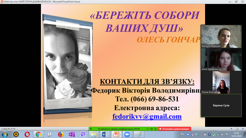 В останні дні наукового тижня відбувся онлайн майстер-клас Вікторії Федорик за темою «Майстерня душевної краси» для здобувачів освіти 1-4 курсів, де учасники мали змогу визначити рівень задоволення власних базових потреб, ступінь балансу тіла, розуму та душі; віднайти способи, які підтримуватимуть душевний спокій та психічне здоров’я.