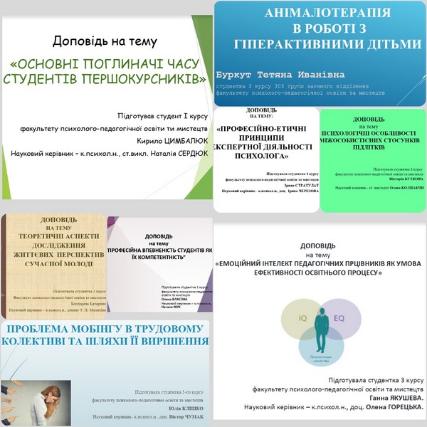 12 травня відбулося засідання студентської наукової секції «Сучасні орієнтири психологічної науки: традиції, досвід, інновації», на якій було висвітлено результати студентських досліджень з актуальних проблем психології. Здобувачі освіти захищали власні наукові здобутки з різноманітної психологічної тематики, а саме: психологічне здоров’я молоді, розвиток емоційного інтелекту, мобінг в освіті, міжособистісні стосунки підлітків, анімалотерапія з гіперактивними дітьми, основні поглиначі часу студентів першокурсників тощо.