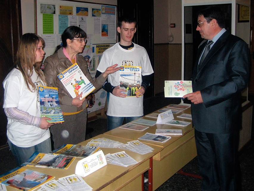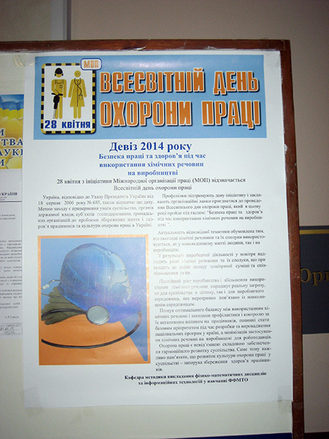 Сьогодні в університеті з нагоди Всесвітнього дня охорони праці та з ініціативи кафедри методики викладання фізико-математичних дисциплін та інформаційних технологій у навчанні факультету фізико-математичної і технологічної освіти проводиться комплекс цікавих заходів. Зокрема, в фойє головного корпусу з самого ранку розгорнуто тематичну виставку (див. світлини), з експонатами якої студенти знайомлять кожного, хто проявить зацікавлення. У кабінеті охорони праці функціонує виставка з історії проведення Всесвітнього дня охорони праці.