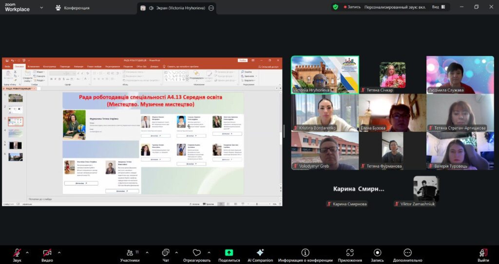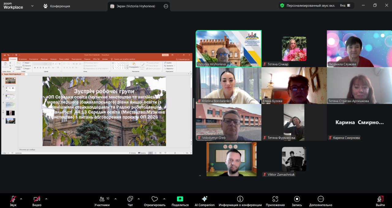 15-го березня 2026 року в онлайн-форматі відбулась зустріч робочої групи ОП Середня освіта (музичне мистецтво та англійська мова) першого (бакалаврського) рівня вищої освіти зі стейкхолдерами та членами Ради роботодавців спеціальності А4.13 Середня освіта (Мистецтво. Музичне мистецтво). Захід був присвячений обговоренню проєкту ОПП 2026 р. та визначенню перспектив її подальшого вдосконалення з урахуванням сучасних вимог ринку праці, потреб роботодавців і тенденцій розвитку мистецької освітньої галузі.