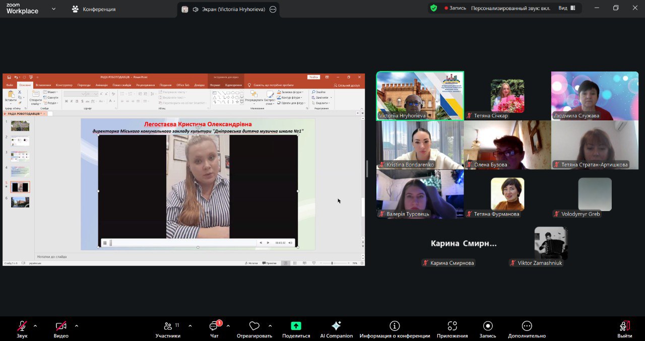 У зустрічі взяли участь зовнішні стейкхолдери та члени Ради роботодавців – Тетяна Фурманова – начальниця відділу освіти виконавчого комітету Бердянської міської ради; Володимир Греб – директор Бердянської гімназії №16 Бердянської міської ради Запорізької області; Юрій Білай – директор Бердянської гімназії №7 «Меотида» Бердянської міської ради Запорізької області; Людмила Служава – заступник директора з навчально-виховної роботи Бердянської гімназії “Гармонія”; Кристина Легостаєва – директорка Міського комунального закладу культури “Дніпровська дитяча музична школа №1”; Валерія Туровець – співзасновниця музичної студії “Voxy Studio” у м. Запоріжжя, випускниця ОП 2024 року; Карина Смирнова – вчитель мистецтва Богданівського ліцею Богданівської сільської ради Павлоградського району Дніпропетровської області; Христина Бондаренко – вчитель мистецтва Бердянської Гімназії «Перлина» Бердянської міської ради Запорізької області; Ольга Маслянка – заступниця директора з навчально-виховної роботи Міського комунального закладу культури «Дніпровська дитяча музична школа №10», а також робоча група ОП. Усі учасники заходу пройшли попереднє анкетування і висловили зауваження та рекомендації щодо змісту проєкту ОП 2026 р.