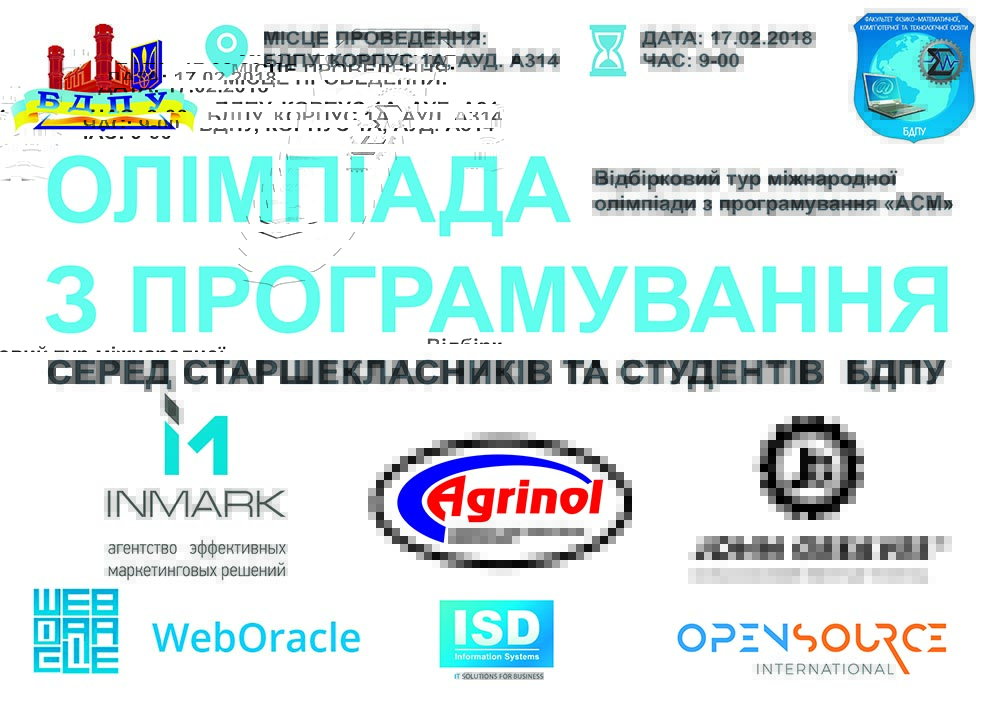 Минулої суботи, 17 лютого, в БДПУ на базі кафедри комп'ютерних технологій в управлінні та навчанні й інформатики відбулася олімпіада з програмування серед студентів і школярів 7-11 класів Бердянська. Вона представляла собою відбірковий тур Всесвітньої олімпіади зі спортивного програмування, де за обмежений час необхідно розв’язати максимальну кількість із запропонованих завдань (інколи проводиться також командна першість).