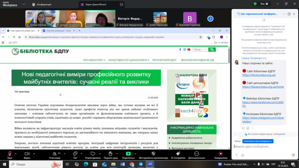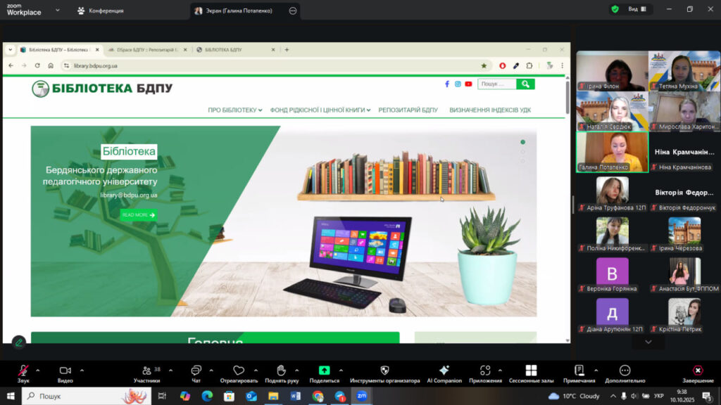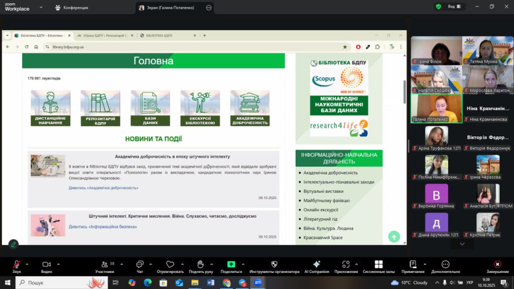 У форматі віртуальної мандрівки учасники ознайомилися зі структурою бібліотеки, дізналися про сучасні сервіси та дослідили можливості офіційного сайту. Фахівці презентували репозитарій БДПУ, тематичні добірки для навчальної, наукової та мистецької діяльності, а також ресурси для саморозвитку, натхнення й професійного зростання.