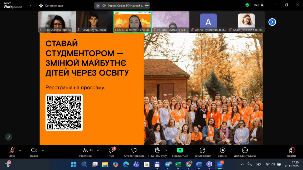 25 листопада в БДПУ відбулась онлайн-зустріч з командою ГО «Навчай для України», до якої долучилося майже 70 здобувачів різних факультетів БДПУ. Захід присвятили програмі «СтудМентор», – ініціативі, де талановиті студенти, молоді фахівці з різних сфер та вчителі підтримують школярів із прифронтових регіонів України, допомагаючи їм подолати освітні втрати, розвивати потенціал і знаходити натхнення в навчанні. Учасники зустрічі дізналися, як саме працює програма, які можливості вона відкриває та які переваги отримують студенти-ментори.
