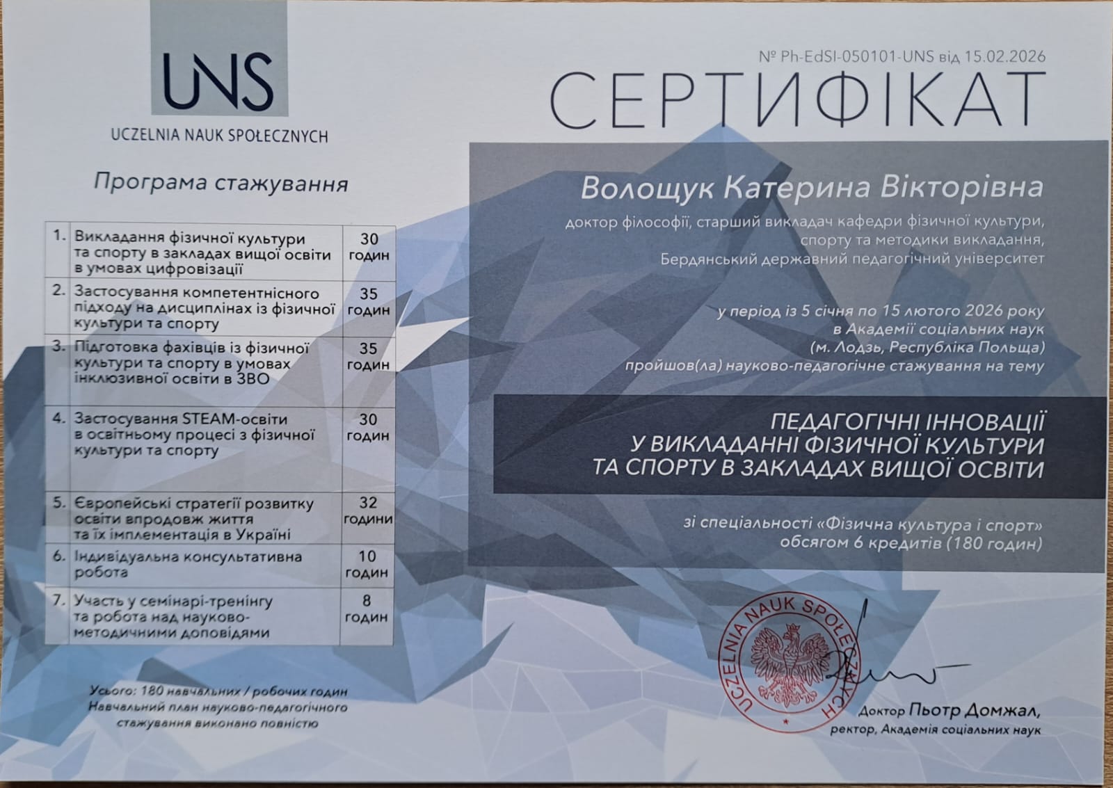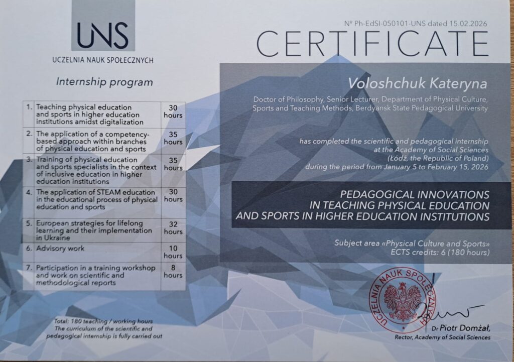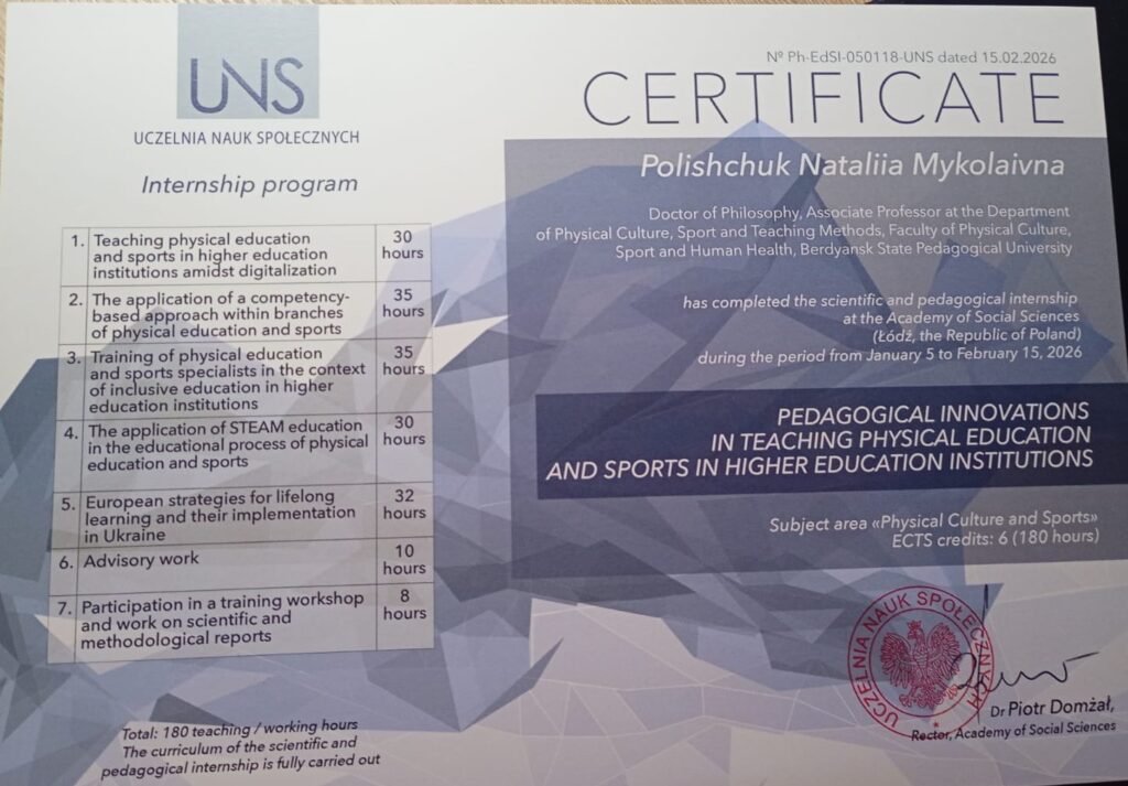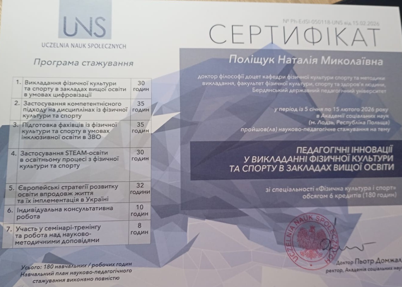 Зокрема, Наталія Поліщук, докторка філософії, доцентка, завідувачка кафедри, та Катерина Волощук, доктор філософії, старший викладач кафедри фізичної культури, спорту та методики викладання, успішно пройшли науково-педагогічне стажування в Академії соціальних наук (Uczelnia Nauk Społecznych, м. Лодзь, Республіка Польща).