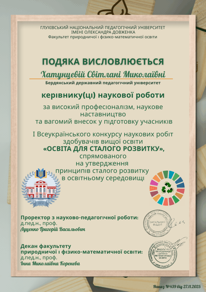 Дякуємо організаторам І Всеукраїнського конкурсу наукових робіт здобувачів вищої освіти «Освіта для сталого розвитку», зокрема декану природничої і фізико-математичної освіти Глухівського національного педагогічного університету імені Олександра Довженка, доктору педагогічних наук, професору Кореневій Інні Миколаївні за високий рівень організації заходу, злагоджену роботу, професійний підхід та створення простору для розвитку молодих дослідників.