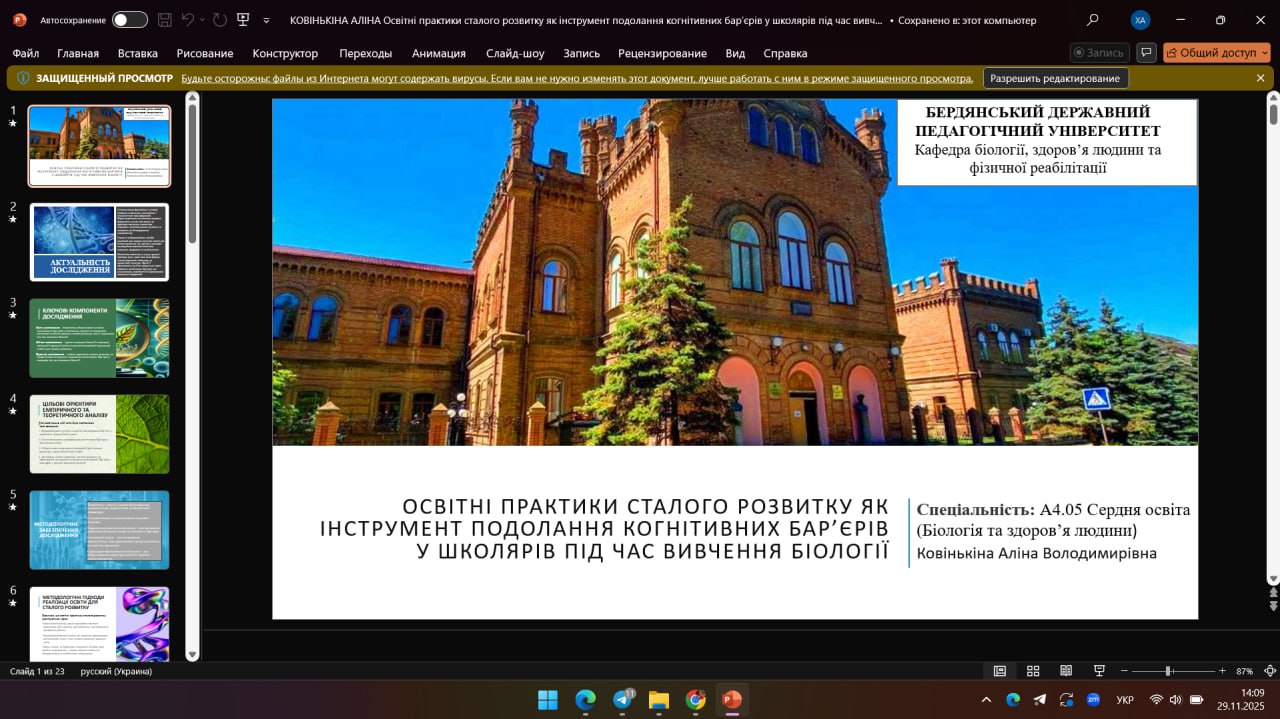 Аліна Ковінькіна вийшла у фінал і представила науковій спільноті роботу «Освітні практики сталого розвитку як інструмент подолання когнітивних бар’єрів у школярів під час вивчення біології»! У своїй доповіді авторка переконливо довела, що сучасна біологічна освіта повинна виходити за рамки традиційного подання знань та перейти до моделі, яка формує в учнів критичне мислення, екологічну свідомість і готовність до саморозвитку. Саме ці компетентності є основою освіти для сталого розвитку – напряму, який сьогодні стає стратегічним орієнтиром модернізації шкільної освіти.