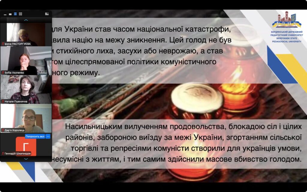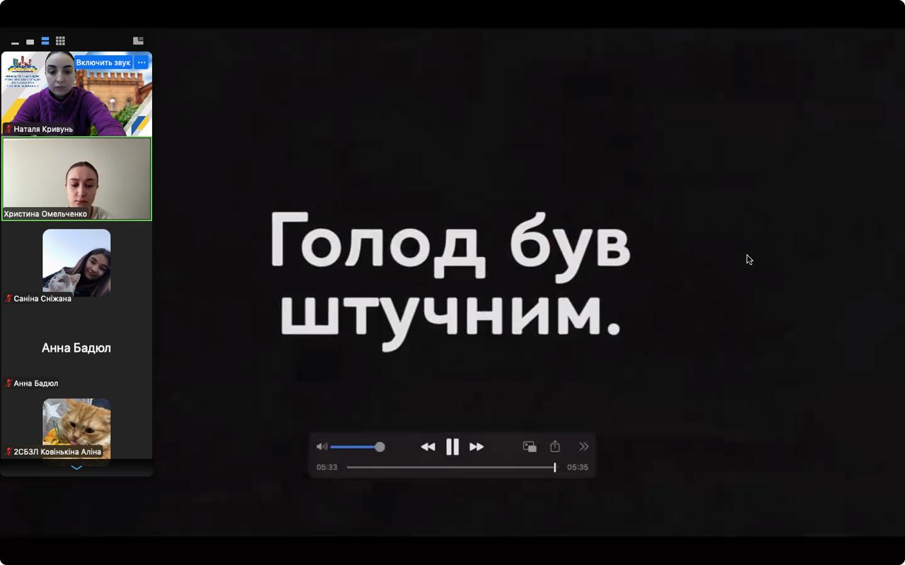 Модераторкою виховної години виступила заступниця декана з виховної роботи Наталя Кривунь, яка наголосила на важливості збереження історичної правди та донесення її до молодого покоління. Вона зазначила, що подібні заходи допомагають студентам глибше усвідомити масштаби трагедії та значення пам’яті про неї для сучасної України.