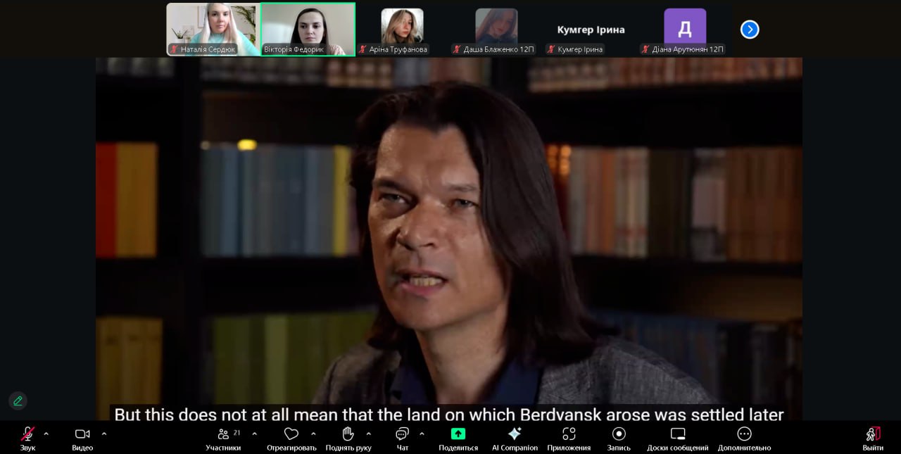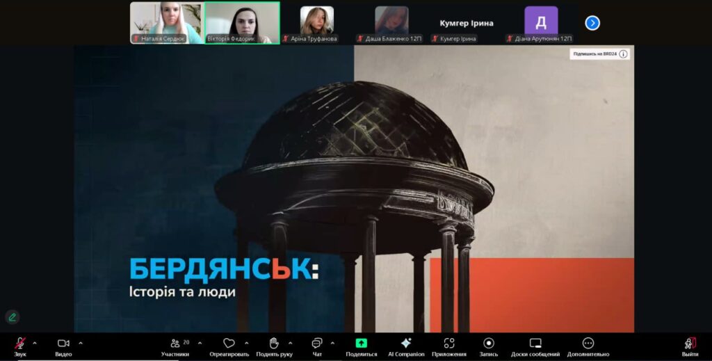 Поринувши в історію міста, учасники зустрічі дізналися про його заснування, етапи становлення, ключові події, історичні постаті. Особливу зацікавленість викликали відомі особистості нашого міста, які продовжують прославляти Бердянськ в цей непростий період його історії. А душевні пісні про Бердянськ дозволили відчути колорит та красу неповторної перлини Приазов’я. Тепла атмосфера зустрічі перенесла учасників в приємні спогади мирного життя та зміцнила надію найскорішої зустрічі з рідним українським містом.