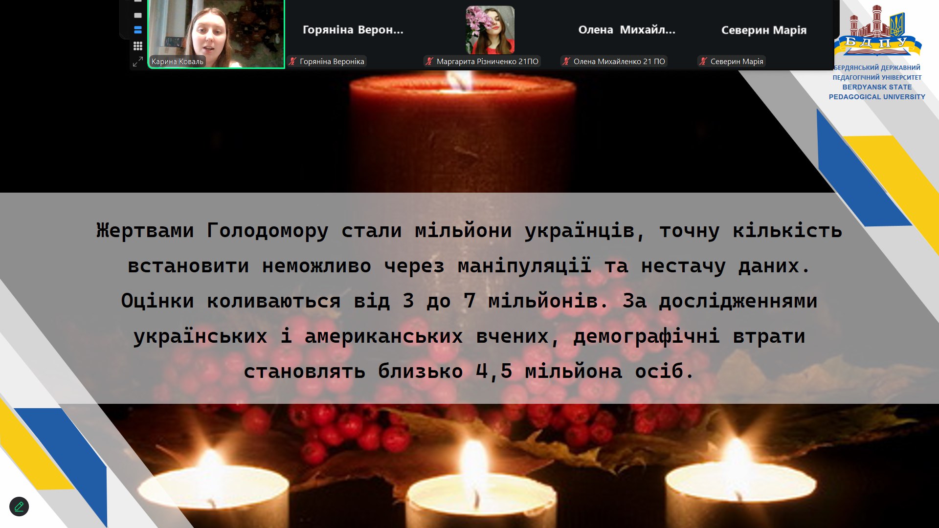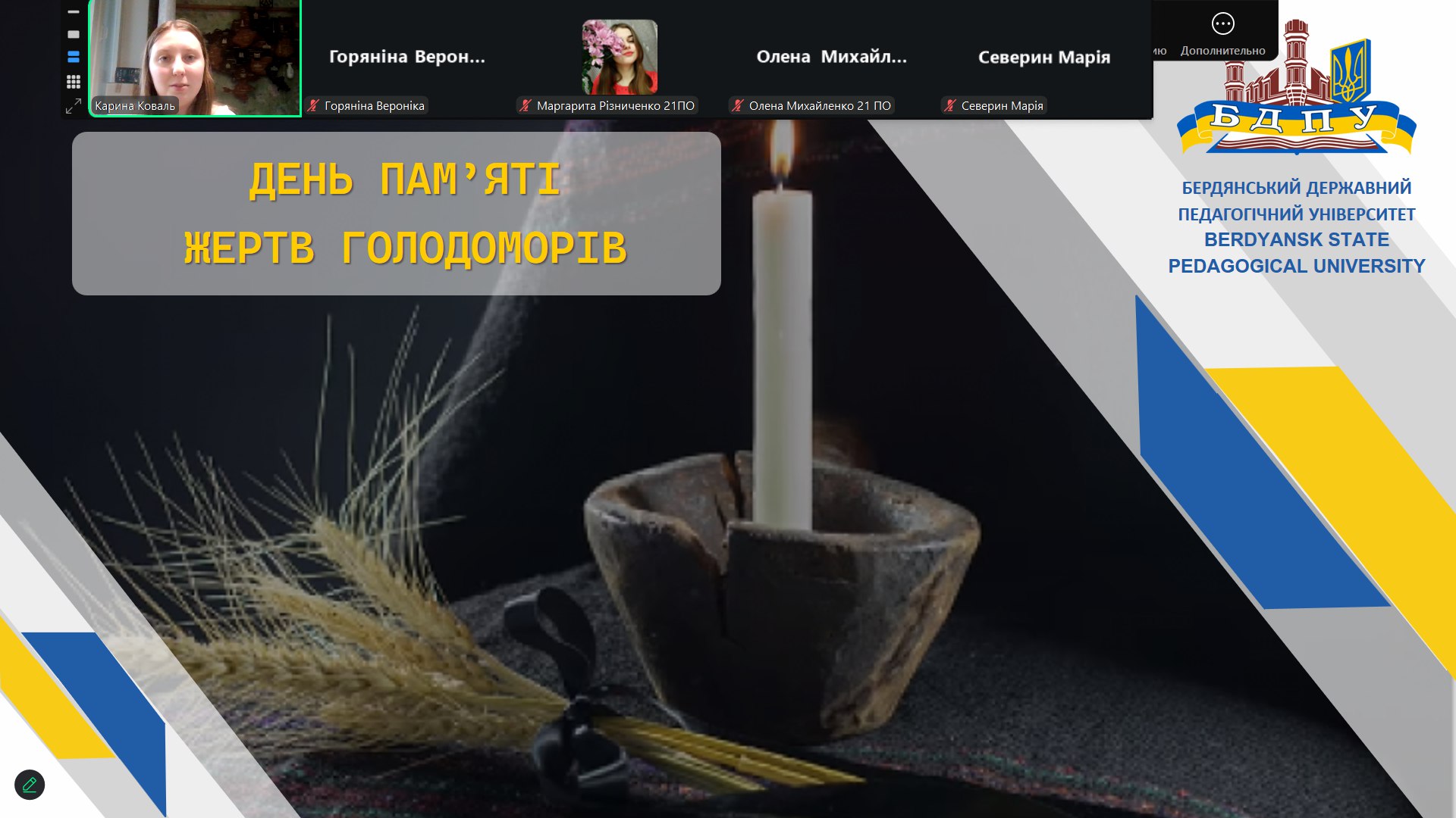 З цієї нагоди на факультеті психолого-педагогічної освіти та мистецтв БДПУ відбулися кураторські години, що стали простором пам’яті й осмислення. Здобувачі вищої освіти разом із кураторами говорили про значення історичної правди, про те, як трагедія Голодоморів вплинула на долю українського народу та формування національної ідентичності.