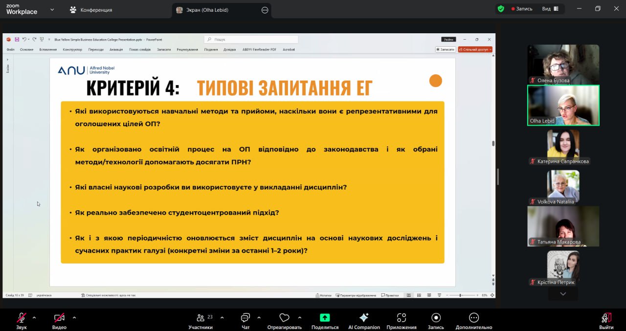 У межах зустрічі учасники детально розглянули алгоритм підготовки самозвіту як основи для експертної оцінки; особливості організації та проведення візиту експертної групи; механізми внутрішнього забезпечення якості освіти; роль академічної спільноти у формуванні прозорих і ефективних процедур акредитації; значення партнерської взаємодії між ЗВО для підвищення довіри до процесу навчання.