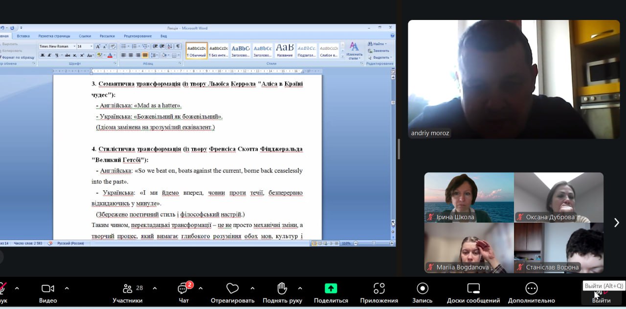 Лекція була присвячена актуальній темі «Перекладацькі трансформації, стилістичні прийоми та лексичні труднощі в художньому перекладі».