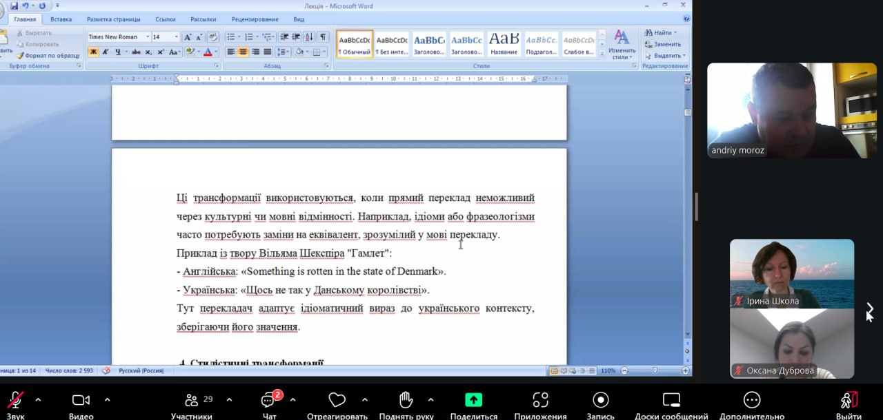 Під час заняття було розглянуто основні типи перекладацьких трансформацій, зокрема граматичні, лексичні, семантичні та стилістичні. Особливу увагу приділено необхідності адаптації тексту до норм мови перекладу з метою збереження змісту, стилю та емоційного забарвлення оригіналу. Студенти ознайомилися з прикладами трансформацій на матеріалі художніх творів англійської та світової літератури.