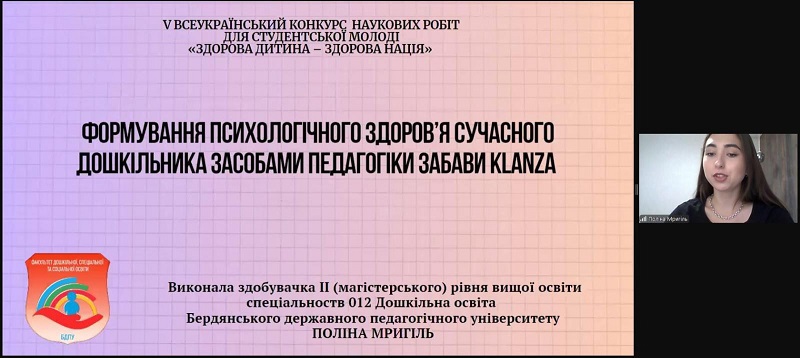 Серед робіт, надісланих на конкурс від Бердянського державного педагогічного університету, була відібрана для заключної конференції науково-дослідна робота «Формування психологічного здоров’я сучасного дошкільника засобами педагогіки забави KLANZA» здобувачки ІІ (магістерського) рівня вищої освіти спеціальності Дошкільна освіта Поліни Мригіль. Основним критерієм відбору була новизна обраної теми, адже анімаційна педагогіка робить у царині дошкільної освіти перші кроки.