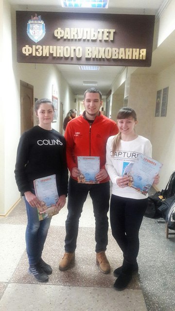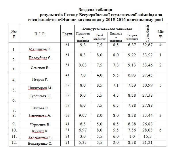 За підсумками результатів виконання всіх завдань І етапу Всеукраїнської студентської олімпіади за спеціальністю «Фізичне виховання» студентка 61 групи факультету  фізичного виховання Євгенія Подлубная стала переможцем; ІІ місце посів Володимир Семенов – студент 51 групи; ІІІ місце зайняла студентка 32 групи Альона Герченова.